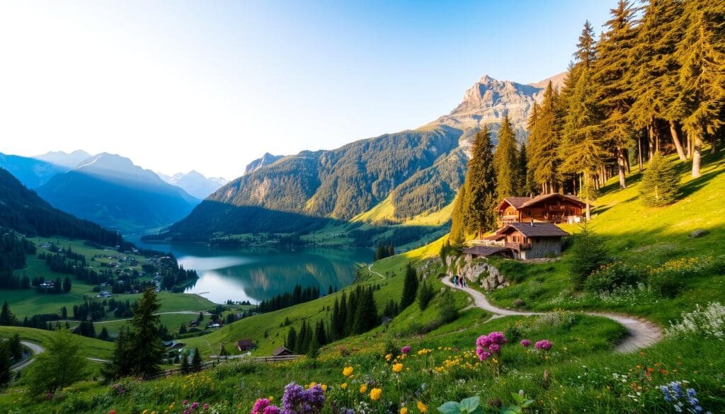 Switzerland’s outdoor activities are for every nature lover. You can ski in Zermatt, hike in the green Engadin Valley, or mountain bike in Valais. Each activity lets you meet Switzerland’s natural beauty up close. Whether you want excitement or a calm nature break, these outdoor adventures have something for all.